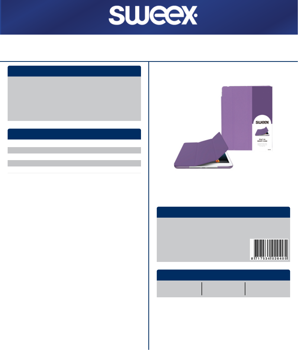 General informationYou can take your iPad Air safely anywhere with this Sweex iPad Air Smart Case. This case protects both the front and back of your